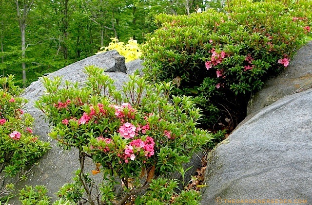 Kalmia latifolia ‘Pink Charm’ emerging from the Great Ledge in the front Entry Garden â“’ Michaela at TGE