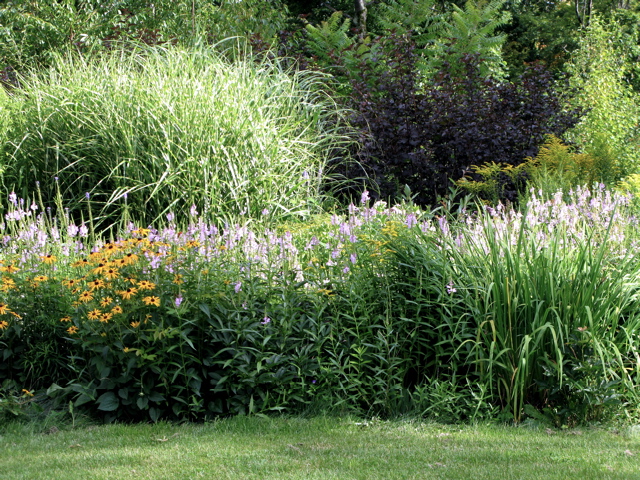 perennial-borders â“’ Michaela at TGEThe long, loose, mixed borders in summer â“’ Michaela at TGE (Plantings here include Physocarpus opufolius ‘Diablo’, Phystostegia, Rudbeckia, and Miscanthus sinensis ‘Variegatus’)