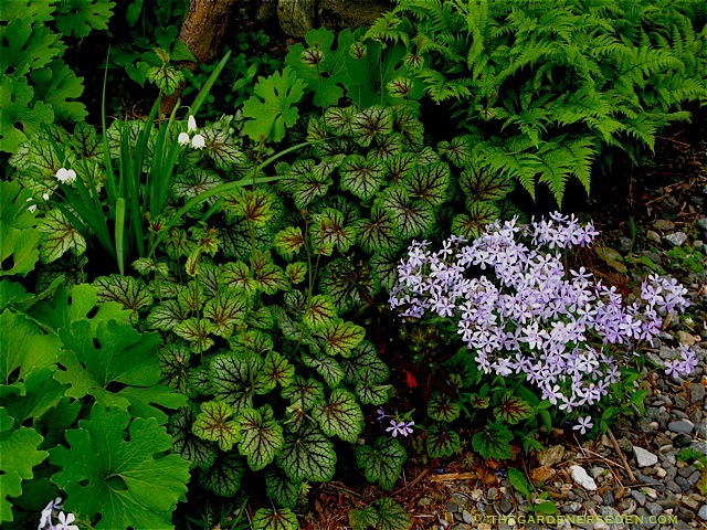 Woodland phlox (Phlox divaricata ‘Clouds of Perfume’), summer snowflake  ⓒ Michaela at TGE  (Leucojum aestivum , bloodroot (Sanguinaria), lady ferns (Athyrium filix x femina) and Heuchera ‘Dale’s strain’ beneath The Blue Green Dragon (Acer palmatum dissectum x ‘Seiryu’)…