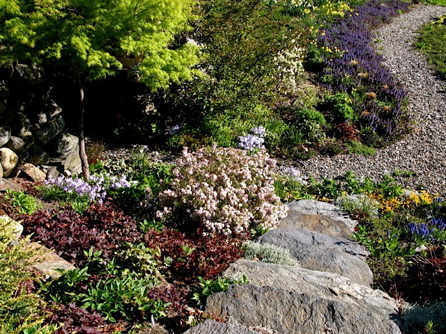 Walkway retaining wall in early summer â“’ Michaela at TGE (Adenophora confusa, Heuchera ‘Palace purple’)