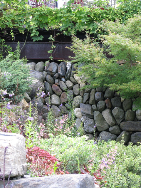 wall schizophragmaGarden Wall and various plantings including the vine Schizophragma ‘Moonlight’, Cimicifuga racemosa ‘Hillside Black Beauty’, Hosta, Heuchera, and above, ‘Holgers’ juniper â“’ Michaela at TGE