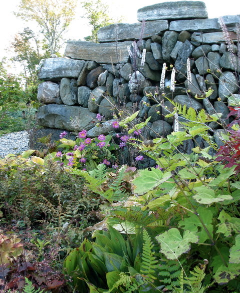 Stone seat with Aruncus dioicus, Baptisia australis and as backdrop Tsuga canadensis