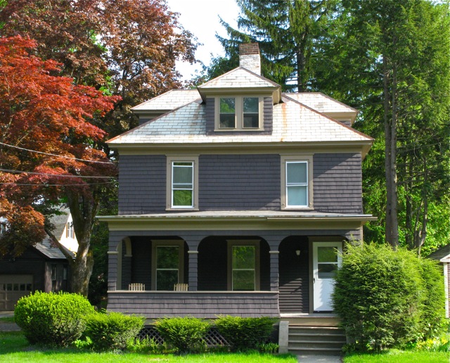 Just look at this sweet little house! It’s easy to see why my clients Laura and Dan fell in love with this place, isn’t it? I was instantly charmed by this classic New England home. From the slate-covered hip roof and romantic front porch to the spacious back yard surrounded by elegant old trees – including a knock-out old Acer palmatum alongside the drive- it’s the perfect small town residence…