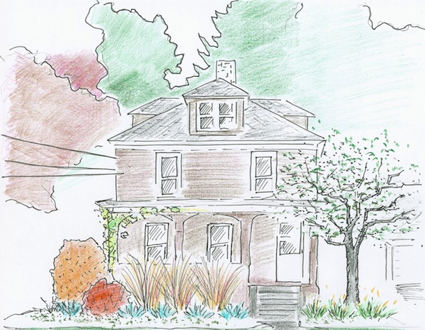Front Yard Garden Design Proposal – Early Autumn View – Drawing © 2010 Michaela at TGE