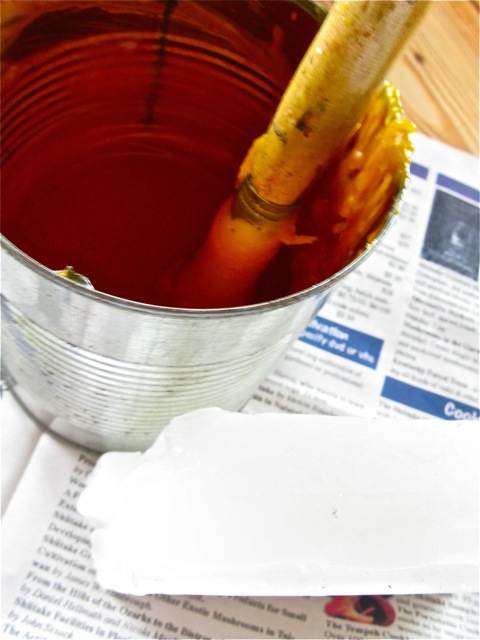 Meanwhile, back in the kitchen, the cheese wax was melted in a recycled tin can set in a double boiler. Once liquified, the wax is stirred with a clean, natural-bristle paint bush and brought out to the logs to seal the shiitake-spawn-plugs…