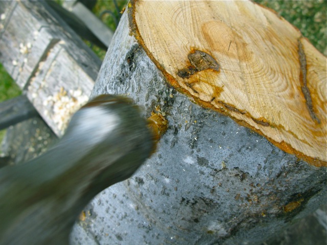 Next, all of the shiitake-spawn-plugs were set into the pre-drilled holes and gently tapped into place with a hammer.