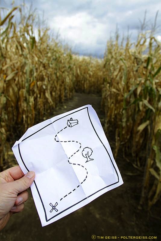 Mazes (sometimes called corn maizes or, historically, labyrinths) are believed to have originated in Europe, where they have been a popular form of amusement for centuries. Although mazes and labyrinths may be constructed using various materials —from grass and clipped hedges to earth and stone— most modern mazes are created with corn. In mid to late May, corn —usually special varieties selected for stalk strength and height— is planted in rows and later (usually in June) cut or tilled into patterns; creating elaborate designs and pathways in fields. Many years ago, patterns for labyrinths were drawn out on paper and cut by hand with sythes. Today, most mazes are cut with tillers or other machinery when the corn is knee-high (some farms use herbicides). Some modern maze designers use computer graphs and GPS coordinates to create elaborate grid patterns. However, many mazes, such as the walking puzzles pictured here —created by the MAiZE company based in Utah— continue to be designed and cut by hand.