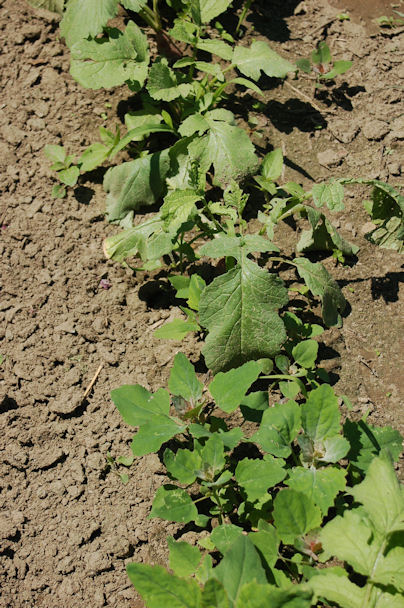 But wait! There is hope. No, it won’t stop the weeds germinating but it could make spotting the row a lot easier. It involves sowing either carrots or parsnips with a faster growing crop, such as radish, together in the same row. Radish are one of the faster growing crops, maturing in as little as 35 days, and will keep pace with even the most vigourous weeds, in my case Fat Hen and Galinsoga (I often hear that mis-pronounced as Gallant Soldier). The radishes are sown relatively thinly. I aim for one every foot, as you may pull the main crop by accident if the density is too great. The radish makes spotting the row quite easy, and I can quickly hoe in between the rows before the weeds get too big and require hand pulling. Hoeing all but a narrow row then makes hand weeding the crop itself a quick -dare I say it- almost enjoyable, task. Then I will reward myself with a freshly pulled radish, or two! Any fast growing crop that you prefer, arugula or Broccoli raab for instance, could be used instead of radish.