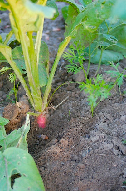 Italian heirloom radish ‘Candela di Fuoco’ and Rainbow Mix carrot seedlings, (photo © John Miller)