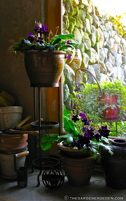 I over-winter many tender plants in my Secret Garden Room (which is really just a glorified basement. I used odd & ends, flea market finds, old cast-offs/unwanted furniture and elbow grease to turn the unused & unattractive space into a shady, garden oasis for all seasons. Click here for more photos of the Secret Garden Room).