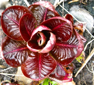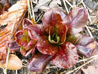 Uncovering sorrel, protected by leaf mulch, in the herb garden