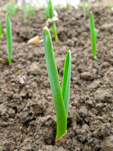 Spanish Roja Garlic emerging in the raised beds, with a new layer of compost added…