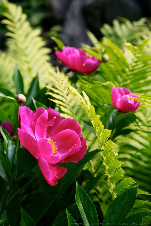 Japanese Single Peonies (Paeonia lactifolia ‘Le Charme’ ) & Ostrich Ferns (Matteuccia struthiopteris). Though I Love the Double and Bomb Type Peonies, Single Flowers Provide Easy Access for Pollinators of All Kinds. And Look How Lovely…