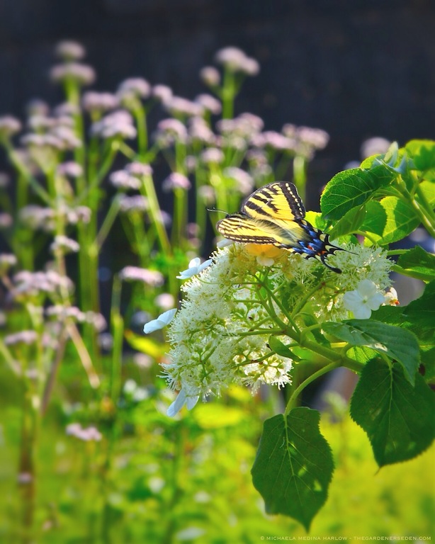 Swallowtail Butterfly on Climbing Hydrangea (Hydrangea anomala ssp. petiolaris) with another Butterfly Favorite, Valerian (Valeriana officianalis), in Background
