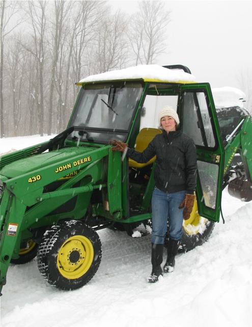 So much for that early spring, eh Michaela? Status report: two feet of snow in the Green Mountains, with an ice storm and a wind advisory, (gusts to 50 mph), winding up right behind. The power has been on and off – mostly off yesterday – for two days. Keep your fingers crossed for me! Thank goodness for Johnny, (that would be my trusty John Deere 4300, with backhoe, shown above with my tired, wet self), long johns, muck boots, fire wood, a well stocked freezer, and two dear, dear men named Ray and Billy.