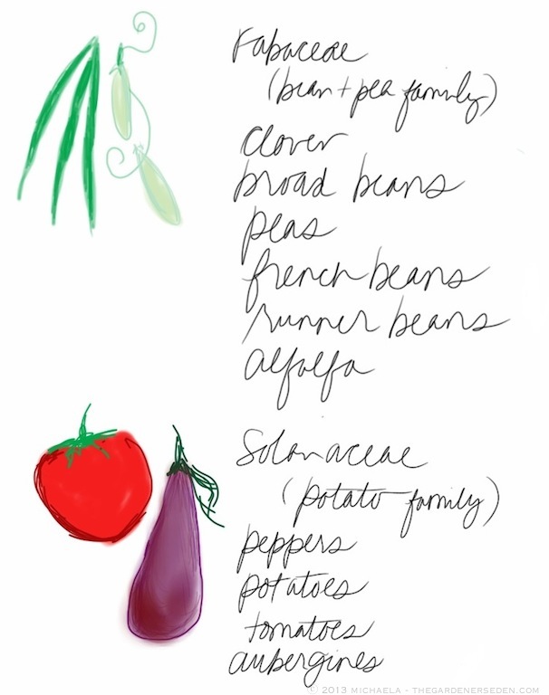 In my previous post —Kitchen Garden Planning, Part One— I mentioned the importance of a keeping a garden journal from year to year. One of the keys to successful, organic vegetable gardening is crop rotation. Insect pests and diseases can be diminished by planting vegetables from the same families —see the basic groupings below— in different locations each year, following a three year cycle.