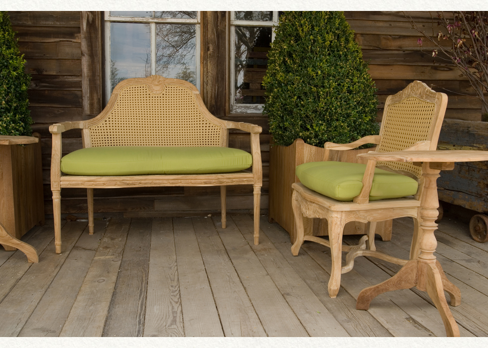 For Casual Elegance Beneath a Porch or Pergola – Terrain’s Scrolling Teak Chair and Graceful, Matching Settee