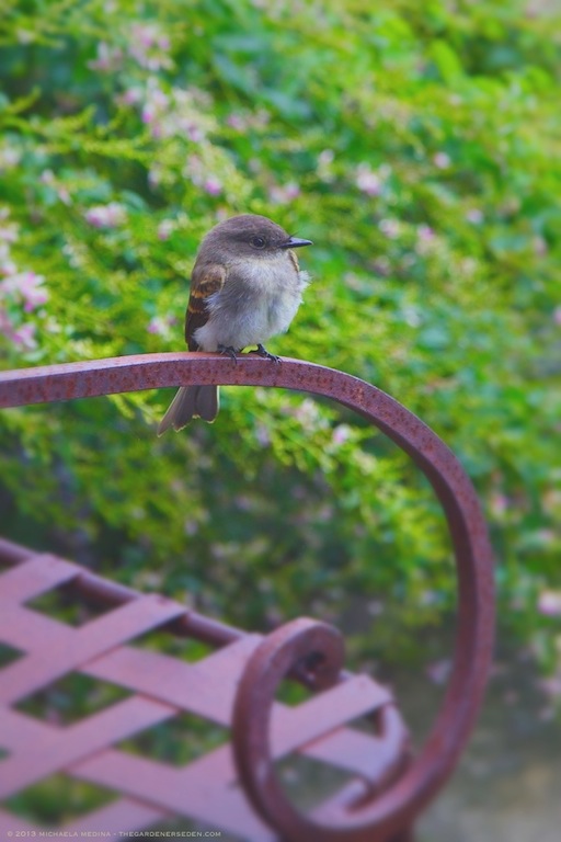 If you are new to birding, the Eastern Phoebe is a relatively easy species to ID. One of the earliest of the migratory birds to return to my garden in springtime, and one of the last to depart in autumn, this flycatcher likes to announce itself —often, rather loudly— by calling out its name, “Phoebe, Phoebe, Phoebe”. Lately, I find one or the other member of this pair, twitching its tail on the armrest of my rusty garden bench. Although it’s an omnivore —consuming small fruits and nuts in addition to live prey— the Phoebe’s diet consists mainly of flying insects; including flies, beetles, moths, wasps and ticks as well as other insects and arachnids. Some years the Phoebes raise two broods in their moss-lined nest; making the Secret Garden a fun spot to observe fledglings as they experiment with new, wobbly wings.