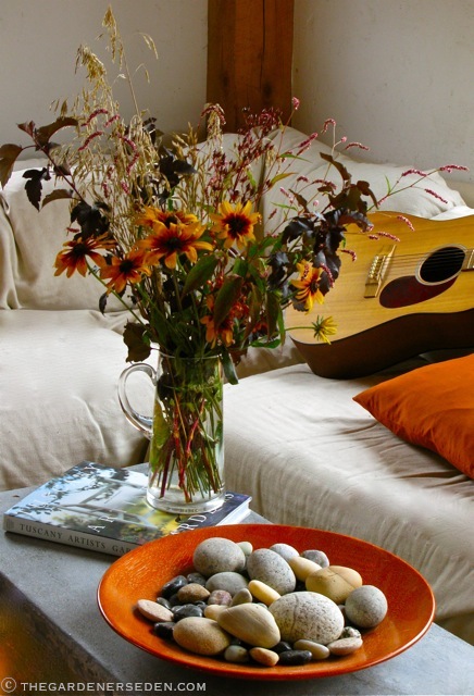 Harmonious late-summer floral arrangements in lavender and gold strike a rich and resonant chord on a grey September afternoon. Gathered from the woodland edges and surrounding meadow, gypsy wildflowers and late garden bloomers fill the house with vibrant color. Whether grouped together in a classic orchestra, jazzy duet, or soulful, solo performance, improvisational floral arrangements are music for the soul…