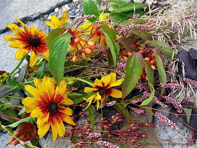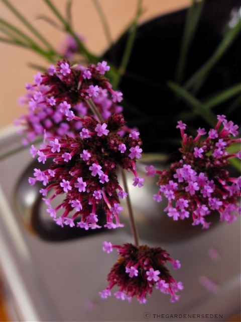 Floral Players, from the top: Rudbeckia hirta ‘Becky Mixed’, Physocarpus opulifolius ‘Diabolo’, Viburnum setigerum, and wild Polygonum pensylvanicum (smart weed). Second photo: Playing ‘Lavender Mist’ – Verbena bonariensis, solo in a vase/pitcher by Aletha Soule. Third photo: Solidago in a solo act. Fourth photo: Rudbeckia hirta, with a Martin steel-string guitar. Fifth photo: Verbena bonariensis for an encore. Sixth photo: Audition shot with players from the garden and field, Rudbeckia hirta, Physocarpus opulifolius, Viburnum setigerum and wild Polygonum pensylvanicum (smart weed). Seventh photo: My old clarinet and Solidago in a sweet duet. Eighth photo: The players, together in a studio session. And last photo, the Lady of the Lavender Mist: Verbena bonariensis and a little link-love…