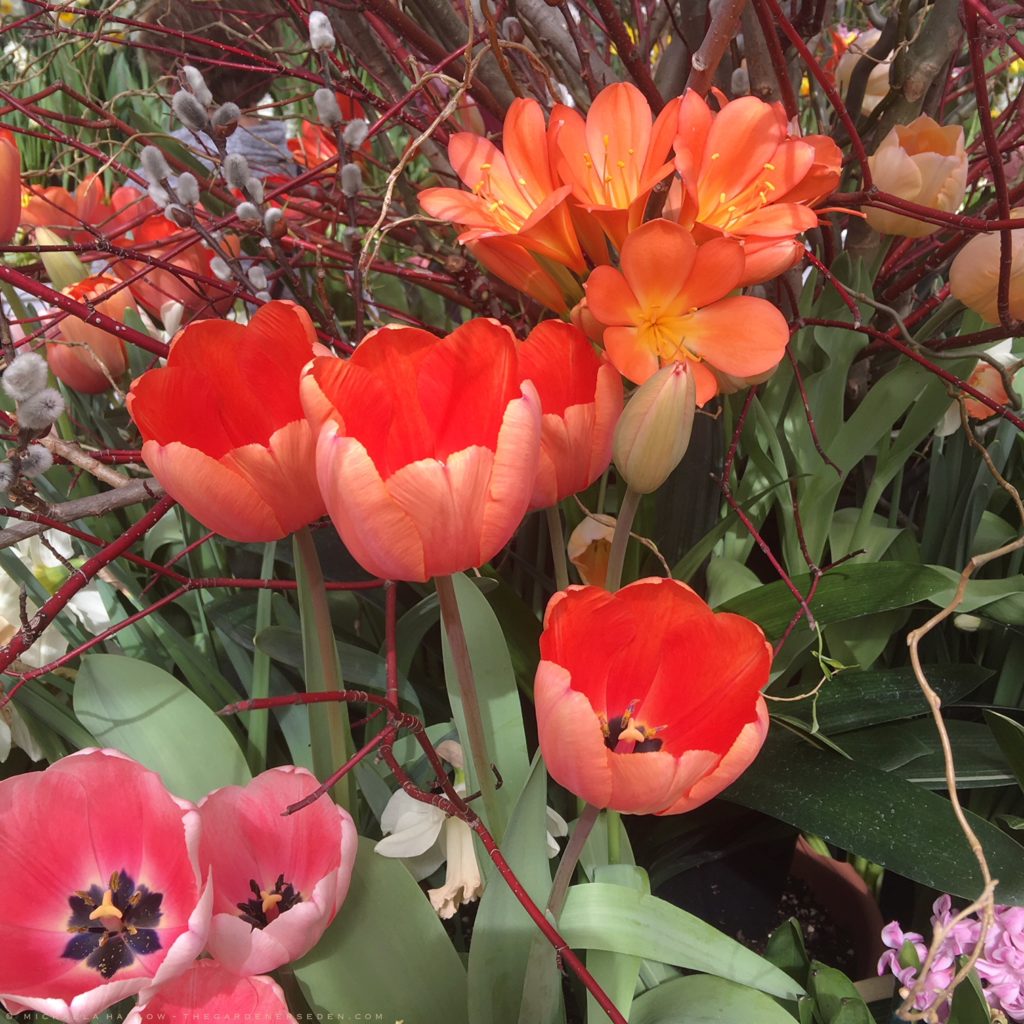 Bold Color & Texture to Inspire: Red Twig Dogwood & Pussy Willow Branches Combine with Hot Hued Tulips and Clivia at Lyman Conservatory