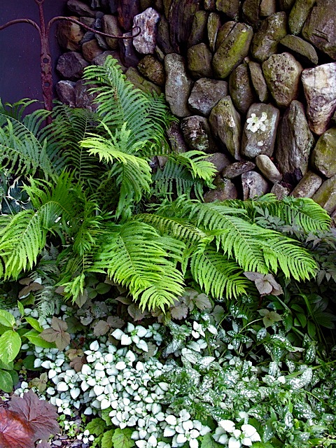 Athyrium x ‘Ghost’ planted to with Hosta ‘August Moon’ , Astilbe, Lamium and Cryptotaenia japonica