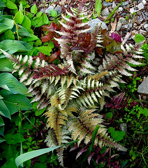 Japanese painted fern, Athyrium nipponicum ‘Pictum’, nestled beside Hosta and seeded Heuchera ‘Palace Purple’
