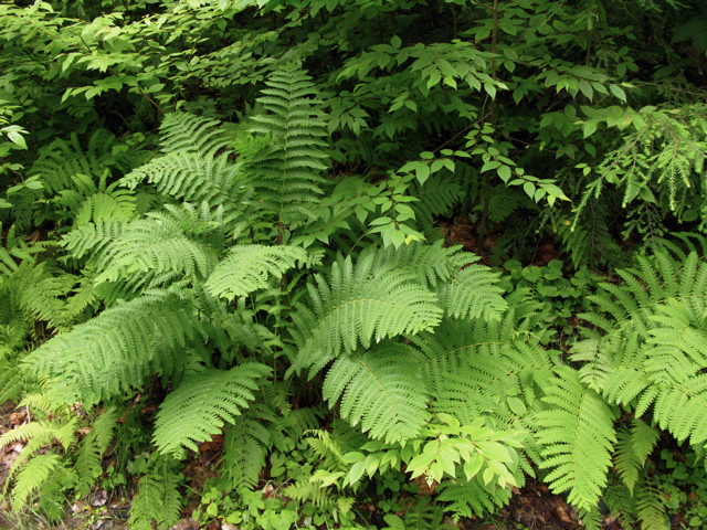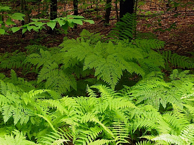 A natural grouping of hay-scented, bracken and interrupted ferns in the forest at Ferncliff.