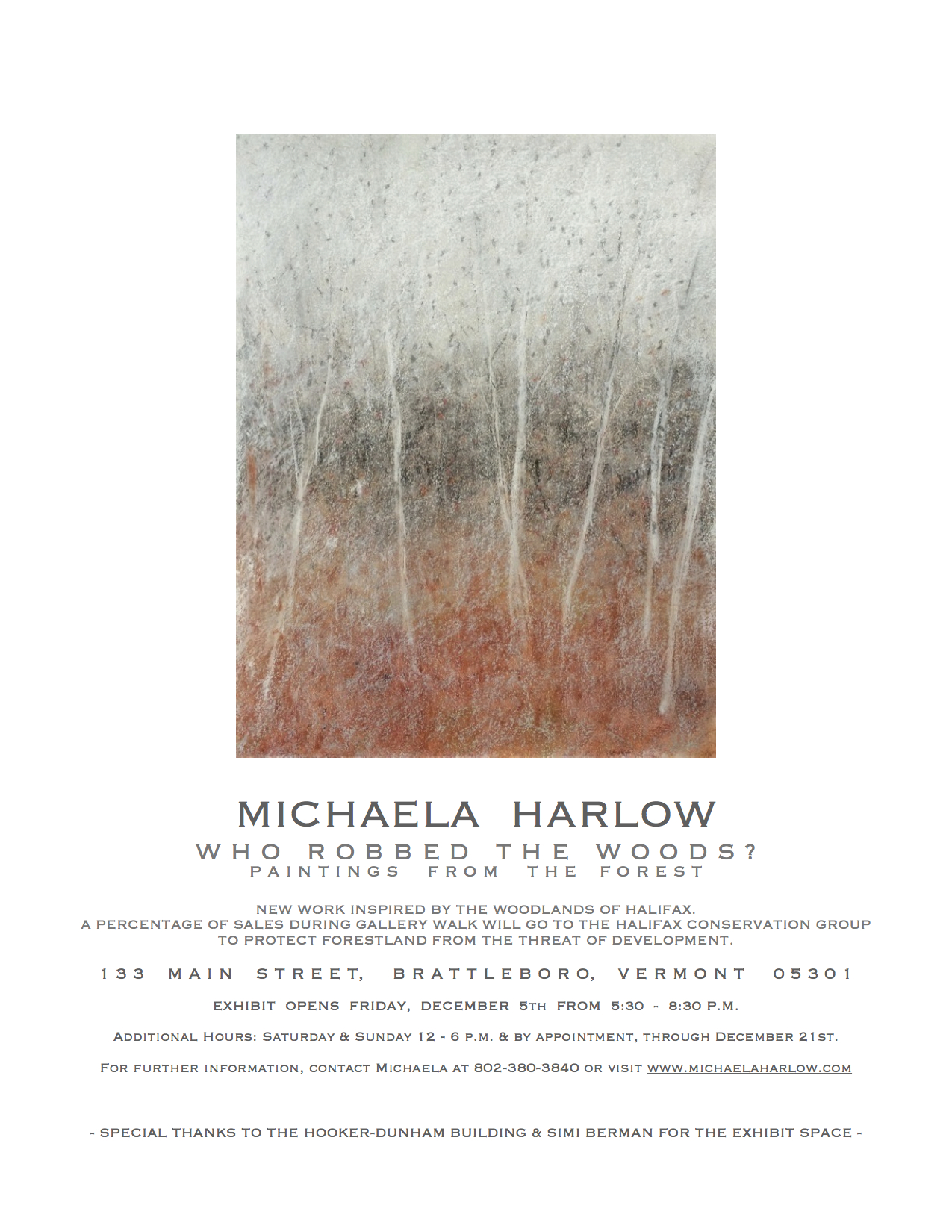 Plans to visit beautiful Vermont this December? Please stop by Brattleboro to say hello, enjoy a cup of cider and view artwork inspired by the wilds of Vermont. I will be exhibiting new work this month at 133 Main Street, Brattleboro, Vermont. This special showing of pastels,”Who Robbed the Woods: Paintings from the Forest”, will be open for viewing on weekends from December 5th through the 21st. The opening reception is December 5th from 5:30 – 8:30 p.m.  I will be donating a percentage of the proceeds to the Halifax Conservation Group, to protect the forestland surrounding my studio and gardens from the threat of development. Information about the Halifax Conservation Group and a donation box to support the cause, will be available throughout the exhibit.