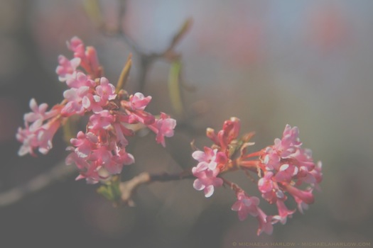 Viburnum_x_bodnantense_'Dawn'_copyright_2014_michaela_medina_harlow_thegardenerdeden.com_all_rights_reservedAt long last, the first petals of my Dawn Viburnum have begun to unfold, and their spicy-sweet fragrance fills the air. Spring has been so slow in coming this year, that every little change seems especially delightful. Viburnum x bodnantense ‘Dawn’, the essence of springtime