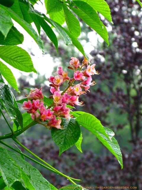 Dodging raindrops between appointments yesterday as I ran up the entryway walk, I couldn’t help but stop when I noticed the loud hum of bumble bees, hard at work in the pretty, pink blossoms of my horse chestnut tree (Aesculus x carnea ‘Fort McNair’). Rainy, cool weather has prolonged the bloom period of this lovely new addition to my garden, giving us all more time to enjoy her late-spring beauty. Planted a year and a half  ago —with Fagus sylvatica ‘Riversii’ to back up her gorgeous yellow-throated rose flowers— this young tree has already begun to develop the lush, rounded canopy for which she’s known. Bumble bees love this flowering tree and —if I’m standing still long enough— I can also catch hummingbirds darting between branches as they sample fresh, sweet nectar from her enormous (7-10 inch panicle size) blossoms…