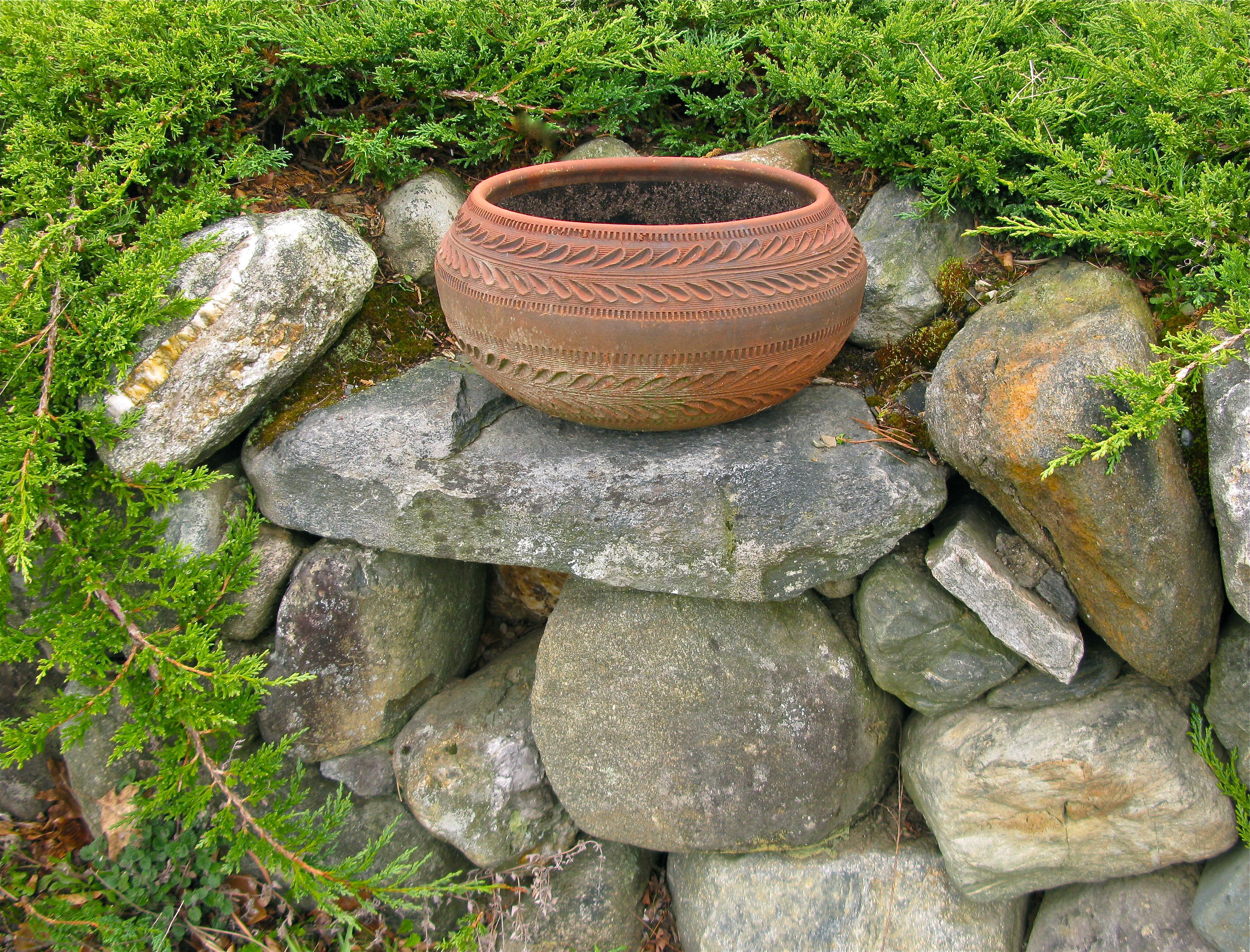 Horizontal juniper, (photo © 2010 Michaela at TGE), pruned to highlight stonework and clay pot focal point…