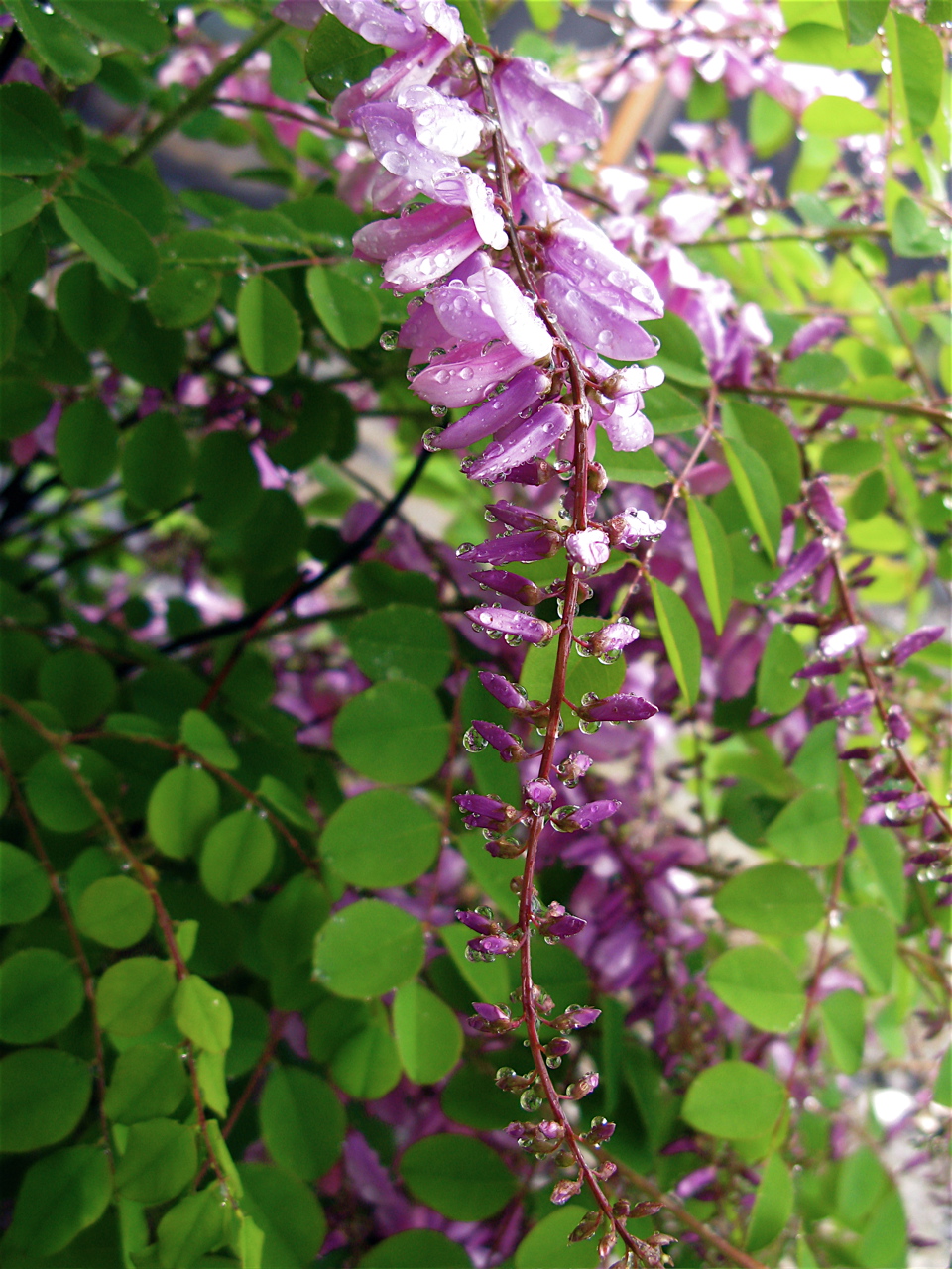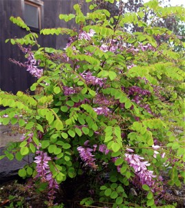 Poetic. Indigofera absolutely glows in the damp, darkness of rainy days and the shadowy, low light of early mornings and late afternoons. This is a romantic flower; reminiscent of castle-bound heroines and hidden, walled gardens. The weeping form and cascading flowers create a slightly wistful, but classically beautiful presence. Although the habit of this little-known Asian shrub is quiet different, the long, lavender panicles of indigofera blossoms remind me a bit of wisteria. And the hue of this gorgeous flower, slightly rosier than wisteria, positively sings against rusty metal, stone and darkened wood. Striking combinations with physocarpus ‘Diablo’, (or ‘Summer Wine)’, and other burgundy-hued, foliage plants immediately spring to mind. Clearly, I have developed quite a fondness for this woody plant over the past few years. When I first sited indigofera on my windy hilltop, I was uncertain that it would survive the brutal winters here. But survive it has, proving tough as nails in spite of its delicate appearance.