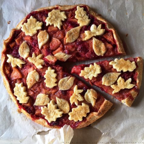 Bring the chilled, prepared galette dough out to your work surface and let it reach room temperature (this may take 10-15 minutes, especially if you have refrigerated overnight). Carefully spoon the cooled fruit filling into the center of the dough and evenly spread the mixture to within 2 -2 1/2″ of the edge. Fold and lightly press the sides of the galette up and over the apple-cranberry filling. Distribute the cookie cut out dough in your desired pattern (if using). Cover the galette with a sheet of parchment paper and place the entire thing in the fridge for about 20 minutes. This is important to set the filling and help maintain the galette’s shape.