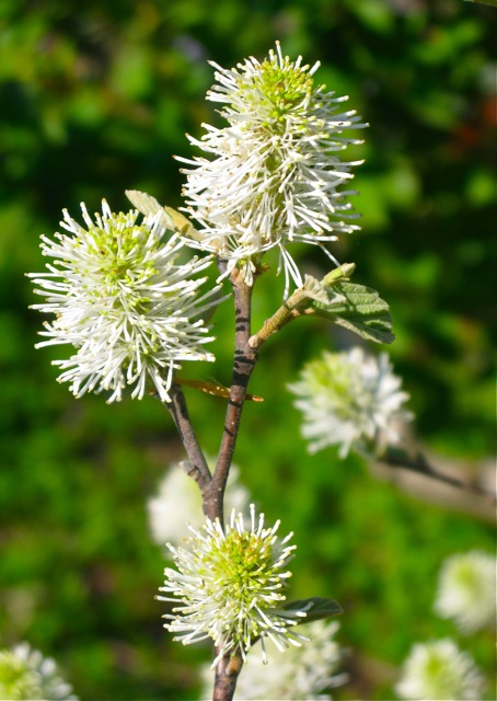 Fothergilla major ‘Mt Airy’ , (in closeup at top of post), is a lovely treat for bees in May…