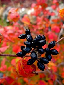 Why such devotion? Well to begin with, although these shrubs aren’t always fragrant, some of the earliest blooming, and most beautifully scented flowers are produced by species of viburnum. The intensely fragrant Viburnum bodnantese ‘Dawn’ blooms at roughly the same time as the witch hazel in my zone 4/5 garden, filling the air with the most wonderful, almost edible, scent. Closely following V. bodnantense in flower is V. carlesii, (hardy in zone 4-8), better known as Korean spice shrub or Mayflower viburnum. This intoxicatingly fragrant shrub is the coveted Viburnum of my childhood memory, and her gorgeous great-grand daughter now occupies a prominent spot near my front door. Come autumn, her leaves will turn brilliant orange-red, (see photo below), and her shiny black fruits gleam amongst the glowing foliage like polished obsidian jewels….
