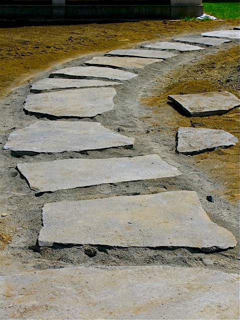 A few weeks back, I mentioned an ongoing project, The Museum Garden, a space I designed for The Brattleboro Museum and Art Center in Brattleboro, Vermont. This public garden connects BMAC to Marlboro College‘s downtown Brattleboro campus building. Once completed, the sculpture park will be filled with three dimensional art, benches, tables and relaxed, native plantings. In order to slow traffic down as travelers pass through the park, I designed a wide-spaced, stepping-stone pathway, set within a sweeping lawn. Landscape contractors Turner and Renaud constructed the walkway from large slabs of smooth “Ashfield stone” from a regional quarry, and then filled the spaces surrounding the pavers with loam, to prepare for a seeded lawn. As you look at these pictures, think about the spaces in your own garden. Do the paths and walkways in your landscape slow you down or speed you up? I will be writing more about the museum garden pathway, and similar, connecting gardens in the coming weeks. Life begins in the garden, and it’s all about the journey, isn’t it? …