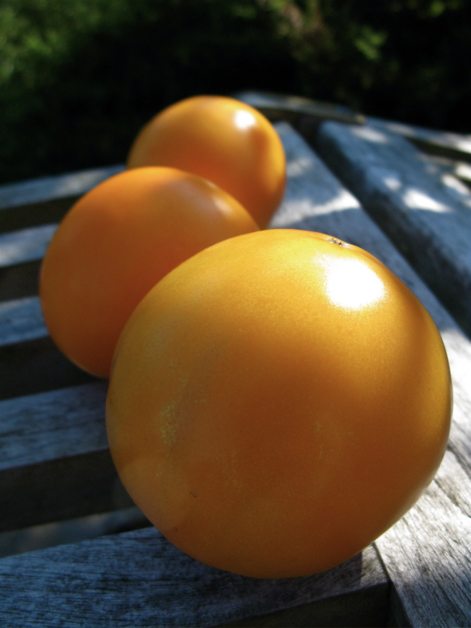This year, I almost think I should rename my favorite tomatoes ‘Gold Blossom’, for they certainly have been a hard-won treasure. It has been a tough summer for growing tomatoes in New England. Last year at this time, I had a bumper crop of tomatoes. I harvested four different heirloom varieties as well as ‘Early girl’ and ‘Lemon boy’s to beat the band. ‘Sungold cherry’ tomatoes were so abundant I was giving them away to anyone willing to take them off my hands. No such luck this year. My tomatoes went in early this summer, (protected by small hoop houses), and were off to a fantastic start. But a cold, rainy June and soggy July soon followed the removal of my protective hoops. The weather in the northeast hasn’t been good for warm weather crops like tomatoes, peppers and cucumbers. My vegetable plants were all slow to establish. Then just as the tomatoes began to blossom, and in spite of all my preventative measures, I noticed the tell-tale yellow spots of early blight on my tomato foliage. Fungus is a real problem in the garden this year, and though my tomatoes have so far been spared the dreaded late blight, I am carefully keeping watch. Cherry tomatoes have been appearing on my table for about a month now, but I only began harvesting ‘Orange Blossoms’ (pictured below), last week, (late for me), and so far my yield is significantly lower. Is it human nature to want what is less plentiful? Maybe its just me, but this precious crop seems to taste even sweeter and more delicious this year.