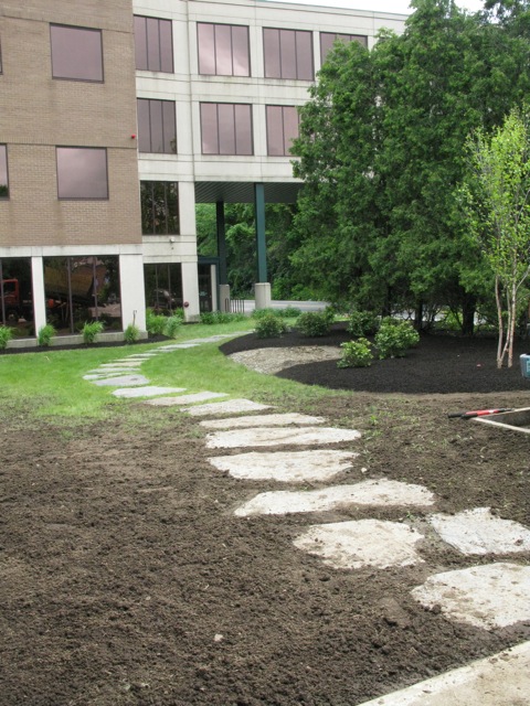 BMAC Sculpture Garden (installation-in-progress) with Dan Snow’s piece, ‘Rock Rest’ in the foreground. Stepping stone walkway, garden hardscaping, lawn and tree installation is all by Turner & Renaud Landscaping. Garden design and plantings (ongoing) by Michaela.