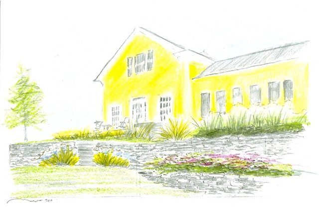 Scanned sketch of a current, large landscape design project: terraced gardens with low-maintenance, relaxed plantings for a new home in Vermont