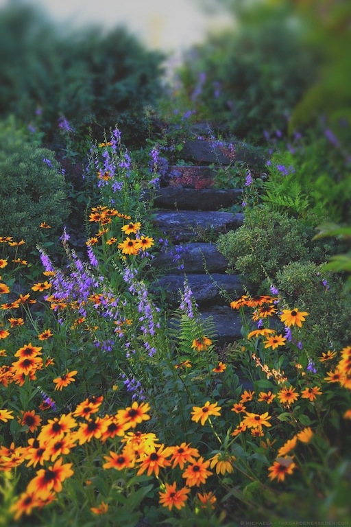 Ladybells and Black-Eyed Susans Tumble Down the Misty, Secret Garden Stairs
