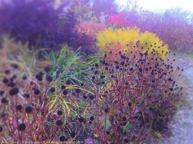Texture and Color Play are Great Ways to Extend Season-Spanning Interest in Perennial Gardens. As a Painter, I Love how the Chocolatey Pom-Pom Remnants of Rudbeckia fulgida, Echo the Dark Mystery of Physocarpus opulifolius ‘Summer Wine’, and how the Feathery, Citrus-Hued Foliage of Amsonia illustris Brings out the Purplish Cast in Both Plants