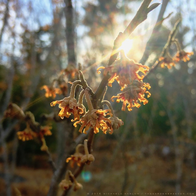 Out pruning and raking in the garden —lingering late in the garden on these long, warm days— the delightful scent of North American native, Ozark Witch Hazel (Hamamelis vernalis), fills the air. When warm weather arrives early in Vermont —as it has this year— the bloom of Ozark Witch Hazel sometimes coincides with, or even precedes the spring equinox. Flowering nearly a month before most other shrubs, the tiny, golden tassels dangle in late afternoon sun, heady with with honeysuckle-like sweetness. Such a rich reward for getting a jump on my springtime chores.