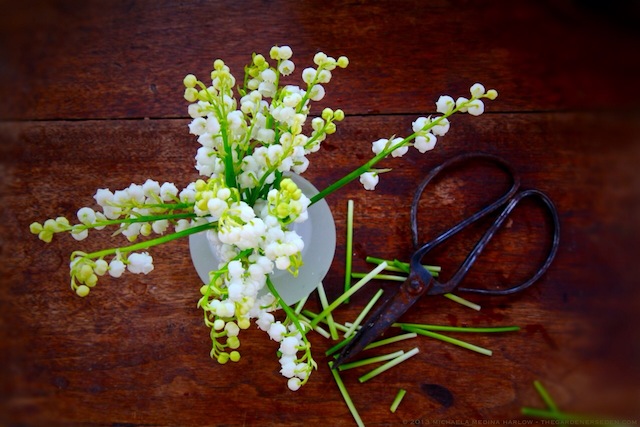 And while out gathering lily-of-the-valley between springtime showers, I made an unanticipated, happy discovery. A favorite pair of Japanese gardening shears —presumed lost in a moment of careless distraction, last autumn— lay partially concealed amongst the muguet; camouflaged by blackened compost and umber leaf mold. Reclaimed in the nick of time, with a bit of oil and a whetstone rub, they’ll soon be no worse for wear. In this moment, I’ll delight in their rust-stained beauty; complement to the bluebell. Treasures lost and found in the rain.