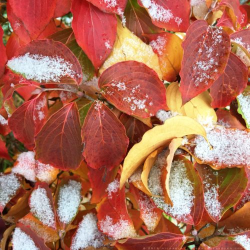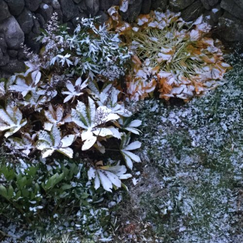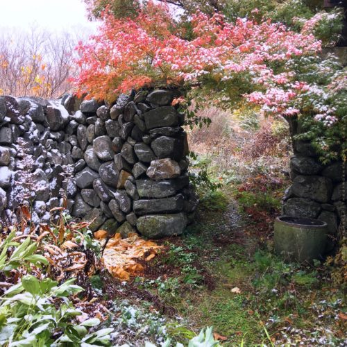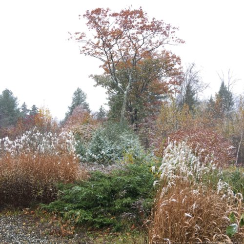Mother Nature had early tricks in mind for Vermont this Halloween, though fortunately, she and her pal, Old Man Winter, kept things light. Autumn snowstorms can be devastating to deciduous trees and shrubs here in New England; especially when the more fragile species are still in full canopy. Two years ago, to the day (October 26-27, 2016), fall foliage held late, and my garden did not escape Winter’s early wrath so easily. There was heavy, wet snowfall and a great deal of damage. Thankfully, this year’s snowliage was light and for the most part, less Nightmare Before Christmas and more pre-Halloween treat . . .