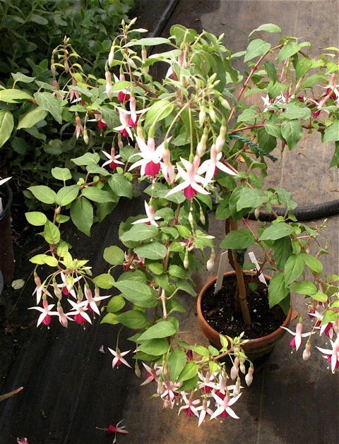 Although this introductory post is brief, I will be back with more coverage of the fascinating work going on at The Old Schoolhouse Plantery soon. Â Fuchsias, Begonias, Impatiens and other exotic beauties are just the beginning of what you will see here. Â John has generously offered to share the process of creating a fuchsia standard, (pictured at bottom), and I am keen to learn more about Diane’s handcrafted flower pots.