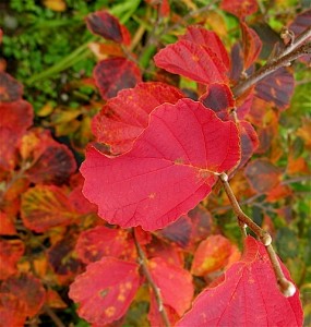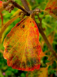 Hamamelis x intermedia ‘Diane’, autumn color varies from mixed orange hues..