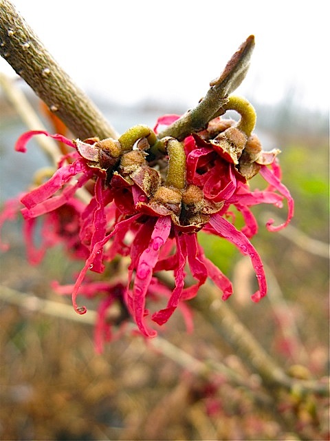 Today’s grey clouds ushered in the first spring rain, and with it, the slightest breeze from the south. It’s still quite chilly, but every morning I am drawn outside by the promise of chartreuse-green bulb-tips, glowing as they break ground. Distracted by emerging snowdrops as I meandered down the walkway, suddenly I stopped; halted in my tracks by the sweetly scented air. Springtime’s sorceress, witch hazel ‘Diane’, beckoned from the edge of the path. Like magic, I was drawn in, enchanted by her fragrance. Up close, hundreds of ruby to copper hued blossoms explode like tiny fireworks in the dim light. This crafty witch is a relatively new addition to my garden, and she is a real show-stopper; lighting up the dull, barren landscape.