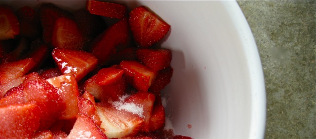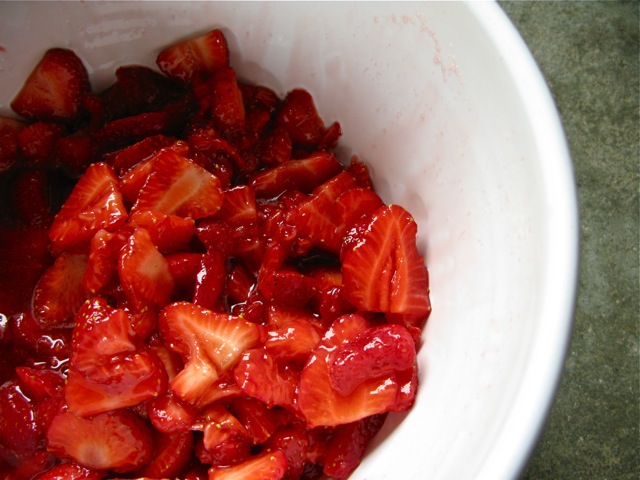 In order to get a juicy bowl of shortcake, you need to start at least an hour ahead. I don’t hull freshly picked berries, but if you prefer to do this, hull right before you slice them, or they will dry out. Wash and pick over the berries, and slice them, (not too thin… gross), into a bowl. Mash about 1/3-1/2 of them, but don’t turn the whole bowl into mush, (again, gross). Add sugar, tasting as you go, then cover the bowl and refrigerate for an hour or so. You can whip the cream and vanilla ahead of time too, if you like, and refrigerate. Some people prefer sugar in their whipped cream. I like mine unsweetened in this instance, to create a contrast between the tart/sweet berries and the vanilla-tinted cream.
