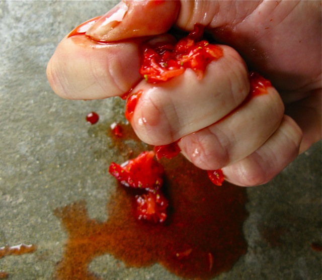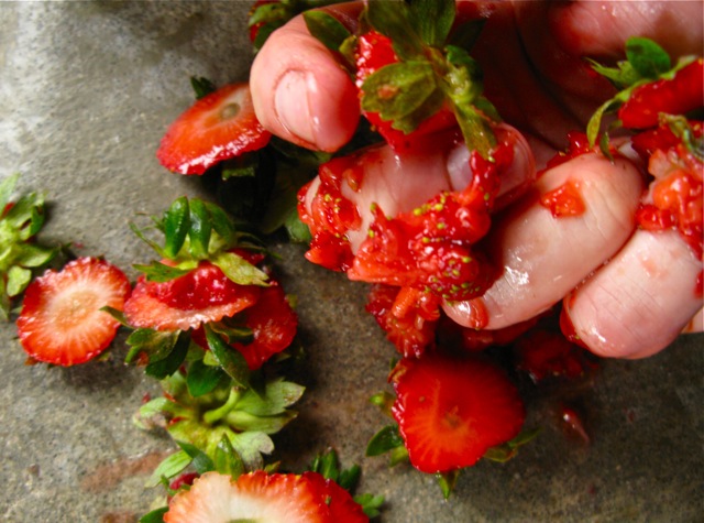If you’ve ever grown strawberries -or spent time picking them on hazy summer days- you know that there is a point in late June when the berries ripen so quickly, that you can’t keep up with the harvest. Add humid weather -which we often get in New England- and a few days of steady rain, and soon all of the over-ripe berries start rotting right on the plants. My dad instructed us to pick off these mushy, often slimy berries, to protect the rest of the crops from mold. And sometimes, after a particularly wet week, we would have as many throw-away berries as market-worthy fruits. Usually we would fling these slimy rejects as far away as we could; aiming for distant trees, clanging tin pie plates, wooden stakes or the odd scarecrow. Sometimes, we would collect the mushy berries and pile them on rocks for hungry chipmunks, or toss them into the meadow for birds. But then we got another idea…